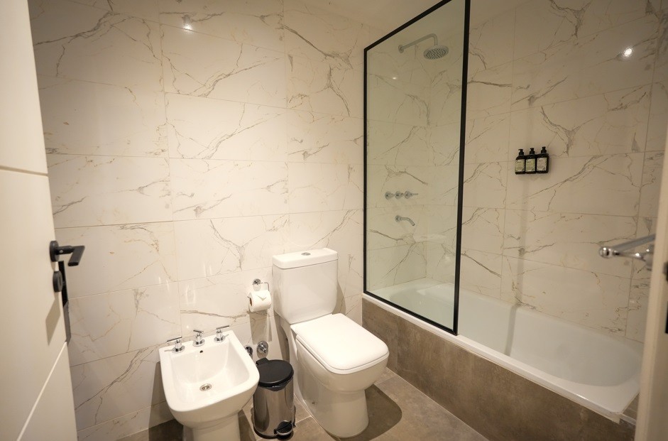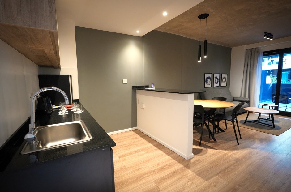 Exclusivo departamento de 2 ambientes de amplias dimensiones, equipado por completo con muebles de la distinguida marca internacional Wilson Tobal, y decorado con detalles de categoría. Dispone de living comedor con ventanales y salida a patio propio, lo que le aporta muy buena circulación de aire. Cocina integrada con mueble bajo mesada y alacena; barra desayunador. Un dormitorio en suite con ventanal. Un baño completo (en suite) y un toilette. Cuenta con aire acondicionado frío-calor. Cochera opcional.