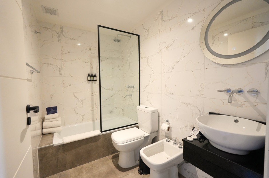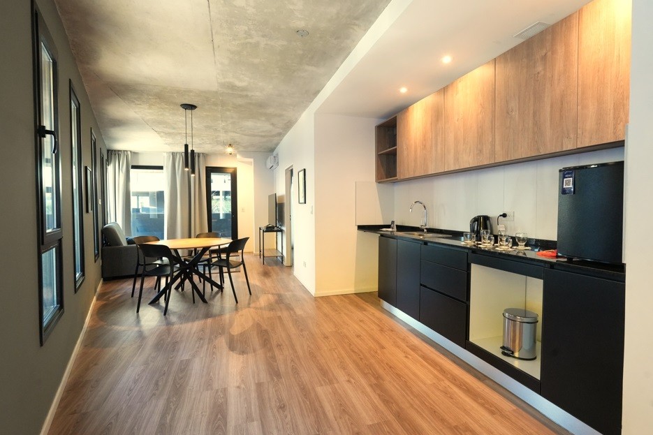 Exclusivo departamento de 2 ambientes de amplias dimensiones, equipado por completo con muebles de la distinguida marca internacional Wilson Tobal, y decorado con detalles de categoría. Dispone de living comedor con ventanales y patio propio, lo que le aporta luminosidad natural y muy buena circulación de aire. Cocina integrada con mueble bajo mesada y alacena. Un dormitorio en suite con salida a patio. Un baño completo (en suite) y un toilette. Cuenta con aire acondicionado frío-calor. Consultar por cochera.